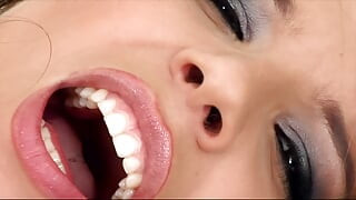 Aspirare cu bale adânc în gât, prim-plan cu ejaculare înăuntru orală